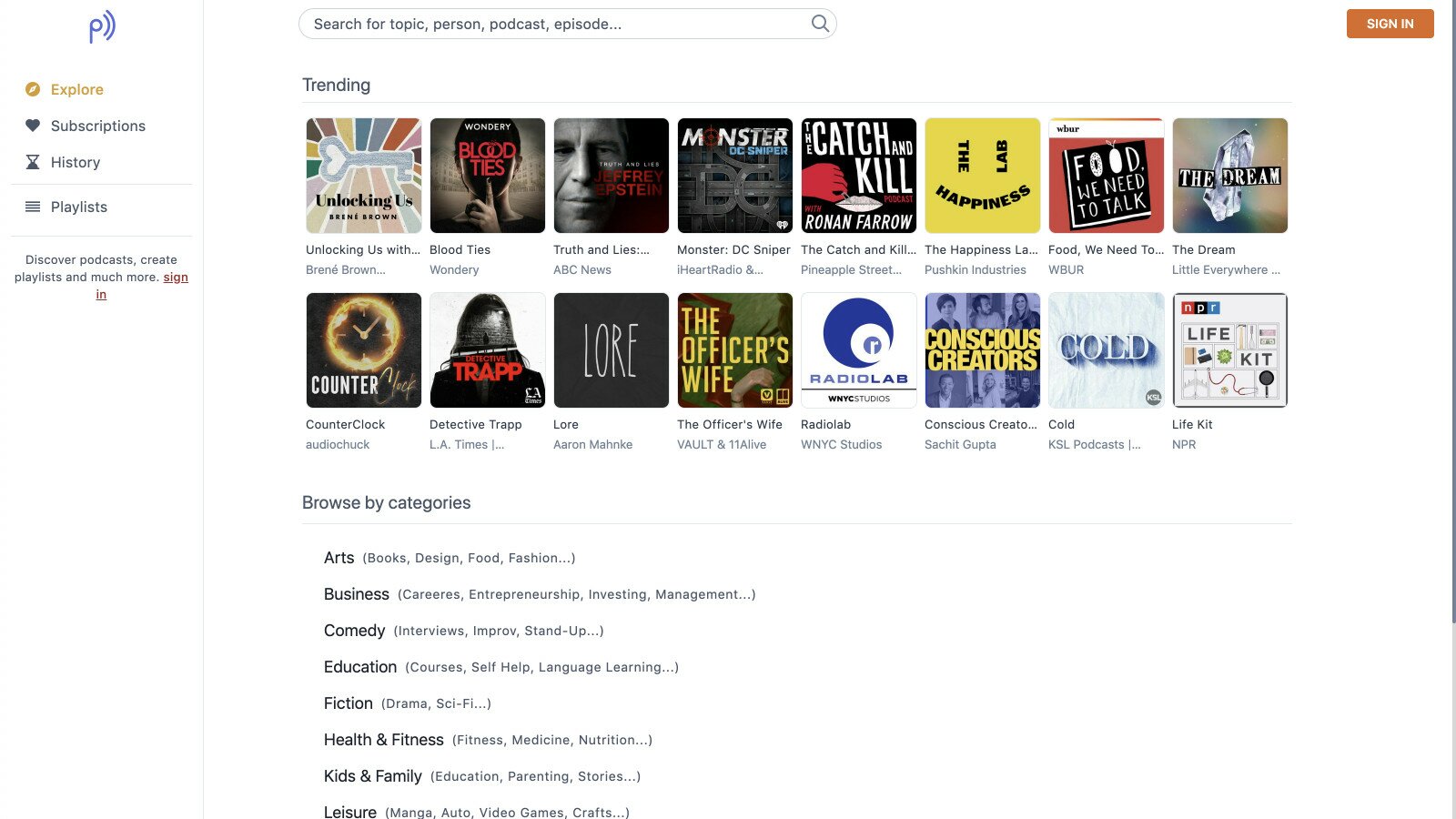 Using Phenopod you can search episodes, subscribe to podcasts and create playlists of your favourite episodes.